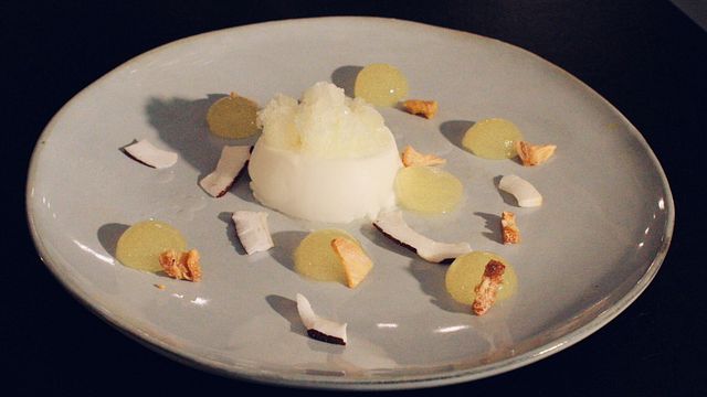 Per la panna cotta alla batida di cocco: portare la panna 60° con la batida e lo zucchero, poi aggiungere la colla di pesce precedentemente ammollata e strizzata. Versare in stampi di silicone e porre in frigorifero per almeno 6 ore.