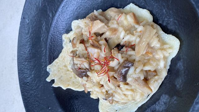 Tostate a secco 160 grammi di riso Carnaroli. Appena caldo aggiungete i funghi porcini, la cipolla, il sale e allungate con il brodo vegetale non salato. Aggiungete i pistilli di zafferano con la loro acqua. A fuoco spento, aggiungete il formaggio grattugiato per la mantecatura finale. Saltate per incorporare aria e aggiungete un po' di brodo vegetale per tenere il riso morbido. Impiattate versando il riso nella cialda.