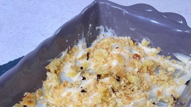 In una pirofila fate un primo strato di besciamella, disponete uno strato di finocchi e coprite nuovamente con la besciamella. Infornate a 180 gradi per 10 minuti. Per la mollica croccante piccante con cui condire i finocchi, mettete il pane in padella con olio uno spicchio d'aglio e peperoncino e saltate per qualche minuto fino a renderla dorata e mettetela sui finocchi una volta tolti dal forno.