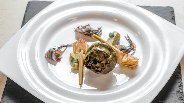 Impiattare il carciofo intero. Aggiungere la crema, il carciofo crudo, l’alice marinata e la maggiorana.