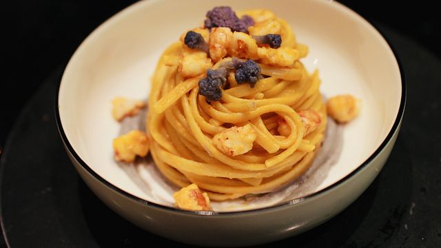 Quando le linguine saranno cotte aggiungete la polpa dei gamberi e spadellate velocemente. Impiattate con il fondo di crema di cavolo viola, le linguine e decorate con i fiori di cavolo messi da parte, anch’essi spadellati per pochi secondi.