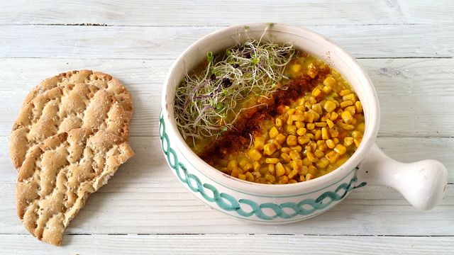 Servite la zuppa ben calda in 4 ciotole e decorate con mais, germogli e paprika.