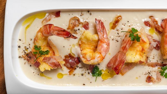 Private del carapace le mazzancolle ma lasciate la codina. Incidete con la lama senza arrivare fino in fondo e poi con il batticarne battete. Passate nella farina di polenta e panate i gamberi. Fate cuocere in olio di semi di girasole. 1minuto e mezzo per lato. Frullate il cavolfiore, il porro e le acciughe ottenendo una consistenza liscia e omogenea. Adagiatevi sopra i gamberi una volta fritti. Ultimate con qualche pezzettino di bacon croccante.