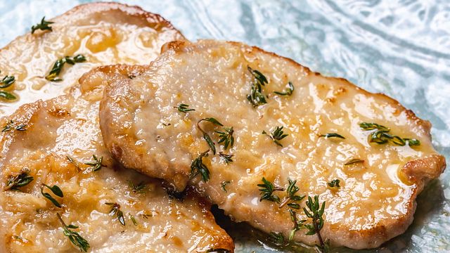 Infarinate le fettine di lonza di maiale, in una casseruola mettete dell'olio e rosolate la carne. Aggiungete la scorza di mezzo limone. Girate, salate e sfumate con vino bianco. Aggiungete il succo di 1limone e riducete il fondo.