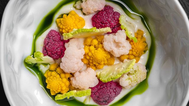 Pulite tutti i cavolfiori tenendo sempre le parti di scarto che serviranno per fare la crema che andrà alla base del piatto. Tagliate sottilmente il cavolfiore verde che andrà messo a crudo nel piatto. Per la preparazione del carpione mettete in pentola dell'aceto di vino bianco, vino bianco secco, 200 grammi di acqua, sale, zucchero. Portate tutto a bollore. Dividete in 3 pentolini differenti. Nel primo aggiungete succo di rapa rossa, nel secondo della curcuma e nel terzo aggiungete timo rosmarino e salvia. Immergete il cavolfiore viola nel carpione viola (quello con la rapa rossa), quello giallo nella curcuma, quello bianco nel carpione incolore.
