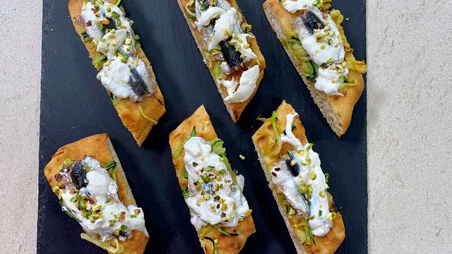 Farcite la focaccia disponendo un letto di zucchine, le sarde e infornate a 180 gradi per 8 - 10 minuti. Salate affettate e completate con pezzettini di burrata e granella di pistacchi.