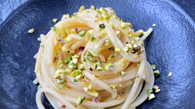 Aggiungete il limone precedentemente preparato. Unite gli spaghetti al dente e risottateli a fuoco medio. Allungate con acqua di cottura e olio. Saltate e aggiungete i pistacchi.
