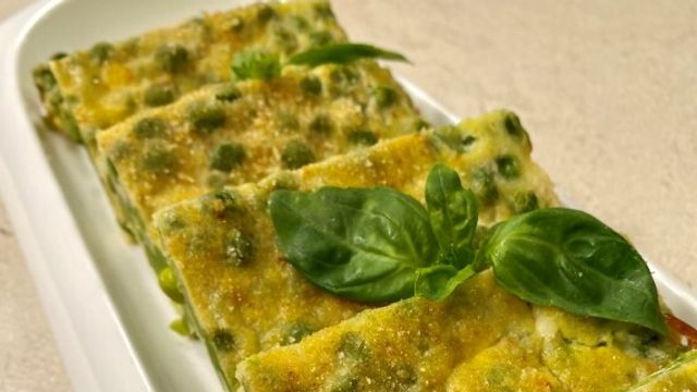 Nel frattempo sbattete 3 uova con 50 grammi di formaggio grattugiato e del basilico. Aggiungete i piselli all'uovo. Oliate una teglia da forno e versate il composto. Compattate bene e versate del pangrattato sulla superficie. Infornate a 180 gradi per 30 minuti.