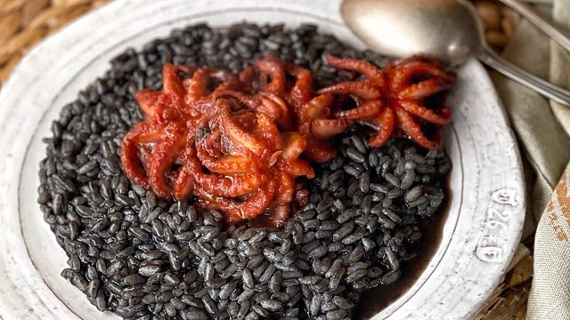 Il risotto al nero di seppia con moscardini in umido è un ottimo primo piatto di pesce adatto alle grandi occasioni ma anche un perfetto piatto unico nutrizionalmente corretto e naturalmente senza glutine.