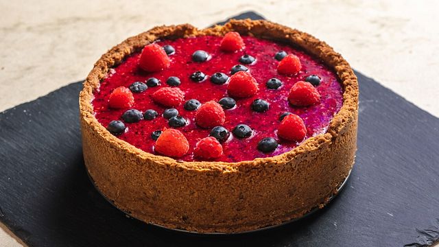 Versate nella base e infornate a 165 gradi per 1 ora. Mentre si raffredda, frullate 90 grammi di lamponi con 60 grammi di mirtilli e 60 grammi di zucchero. Mettete in pentola, portate a bollore, fate raffreddare e versate sulla torta. Completate decorando con mirtilli e lamponi.