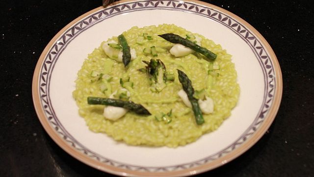 A metà cottura del risotto aggiungere la crema di asparagi e all’occorrenza il brodo.