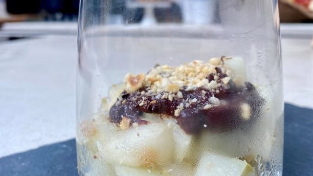 Nel liquido ottenuto versate i pezzi di pera e fateli scottare velocemente, senza farli ammorbidire troppo. Quindi toglieteli distribuiteli in coppette singole.
