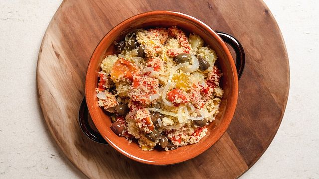 Appassite in olio una cipolla a fettine. Sgranate il cous cous con una forchetta per evitare la formazione di grumi. Condite le patate a fine cottura con olio e sale. Ripassate velocemente il cous cous nella cipolla. Aggiungete sale e olio. Tagliate i peperoni già sbucciati e assemblate gli ingredienti aggiungendo le olive taggiasche denocciolate.