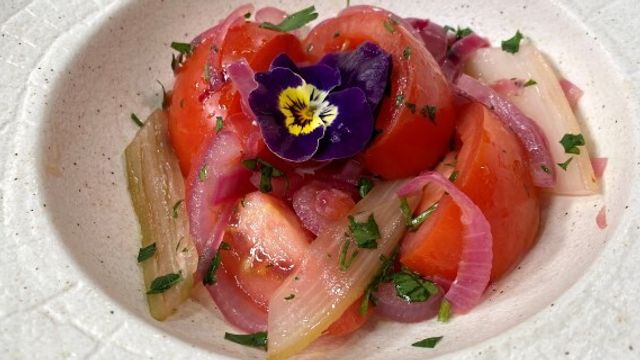 Preparate un'emulsione con olio Evo, aceto di vino rosso e sale. Fate marinare in questo mix sia il sedano che la cipolla. Tagliate a fette grandi il pomodoro, condite con olio e sale. Amalgamate il sedano e aggiungete la cipolla ben strizzata. Decorate con un fiore commestibile.