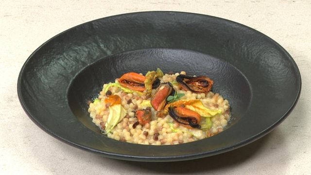 Giunti a cottura, togliete dal fuoco e mantecate con burro, Caprino e i fiori di zucca spezzettati a mano. Aggiungete succo di limone, regolate di sale, impiattate e disponete sulla superficie le cozze, qualche fiore di zucca e foglioline di maggiorana.