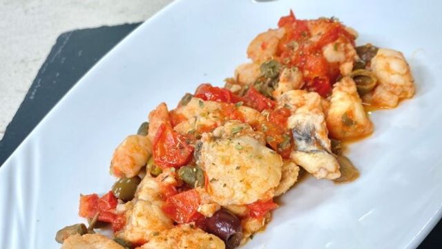 Aggiungete il pesce e fate cuocere a fuoco vivace. Appena asciutto sfumate con il vino bianco, unite i pomodori, i capperi, 20 grammi di olive taggiasche e portate a termine la cottura. Salate moderatamente e aggiungete un po' di origano.