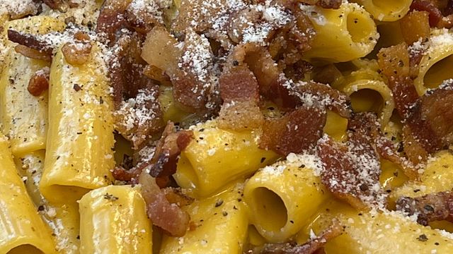 Nella sua versione, lo chef Pelliccia utilizza come formato di pasta i rigatoni, con un’aggiunta di parmigiano stagionato a bilanciare la sapidità del pecorino. E pepe nero macinato, a completare il tutto. Il risultato è un primo piatto cremoso e saporito, gioia del palato.