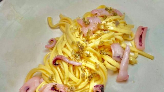 Mettete a cuocere per 4 persone 360 grammi di tagliolini freschi. Essiccate e polverizzate una manciate di capperi freschi al microonde, media potenza per 3 minuti circa. Scolate la pasta al dente e completate la cottura in padella allungando con acqua olio e burro. Aggiungete i calamari, saltate e impiattate. Aggiungete la polvere di capperi essiccata.
