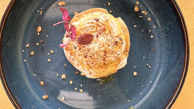 Impiattare alternando una cialda alla crema di ricotta e nocciole, porre uno strato di miele sull’ultima, decorare con delle erbette e nocciole tritate.