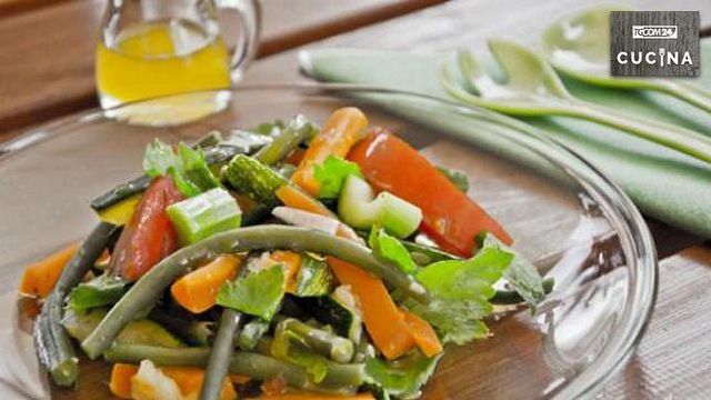 Lavate e mondate le zucchine e le carote, tagliatele nel senso della lunghezza in pezzi non troppo piccoli. Eliminate le estremità dei fagiolini e lavateli in acqua fredda. Lessate le zucchine, le carote e i fagiolini in acqua bollente, scolateli e lasciateli intiepidire.