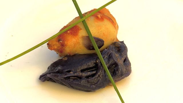 Impiattare con un cucchiaio di purè di patate e due fili di erba cipollina.