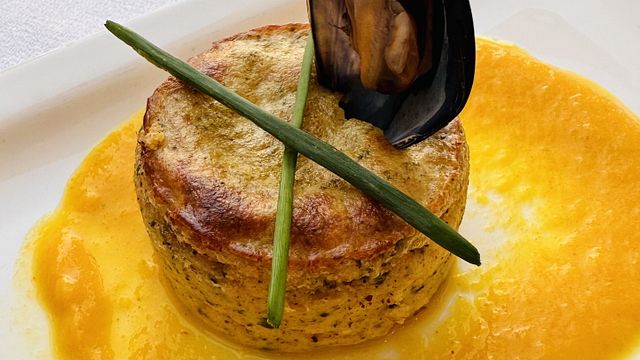 Impiattare con un fondo di crema di carote e patate, porre il tortino centralmente, guarnire con mezza cozza ed un paio di ciuffi di erba cipollina.