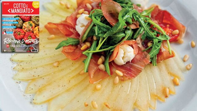 Di fronte ad un piatto così non potrete resistere: bellissimo elegantissimo e freschissimo! Le delicate fette di melone bianco accolgono il prosciutto crudo e le mozzarelline che, con i pinoli e la rucola, creano un contrasto sapido e dolce davvero accattivante. Nella sua semplicità, è una ricetta bilanciata e di rapidissima preparazione, perfetta per un invito dell'ultimo minuto in una calda sera d'estate. Nel numero di agosto di Cotto e mangiato Magazine troverete questa e molte altre fantastiche idee da realizzare con protagonista il melone.