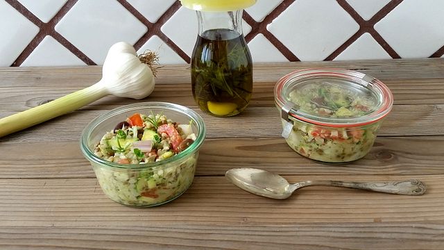 Servite l’insalata di riso in vasetti di vetro monoporzione, sono molto comodi per essere trasportati.