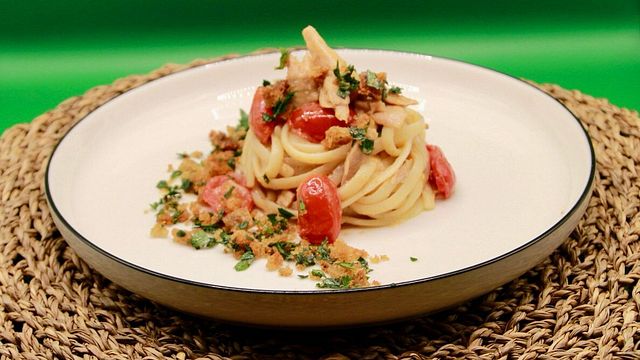 Quando saranno cotte inserire i filetti di tonno tagliati grossolanamente e la metà del pancotto al prezzemolo, saltare le linguine ed impiattare con una base del pancotto rimasto.