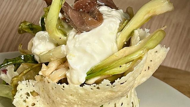 Una volta insaporite le puntarelle con il battuto, potrai sistemarle nei cestini e guarnirle con un’alice.