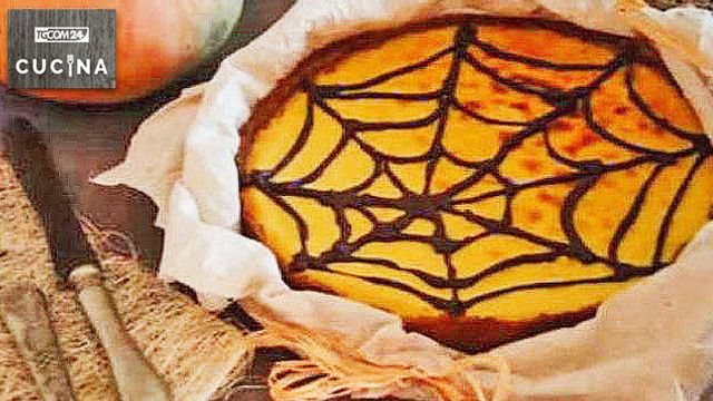 Riempite di cioccolato una siringa per dolci con bocchetta stretta e liscia e disegnate una ragnatela sulla superficie della cheesecake alla zucca.