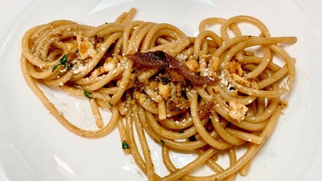 Mettete a cuocere gli spaghetti. Versate nella padella il condimento, aggiungete la pasta al dente e mantecate con il pecorino. il prezzemolo tagliato a julienne e dell'acqua di cottura. Saltate e impiattate. Cospargete con il crumble, il formaggio e un acciuga.
