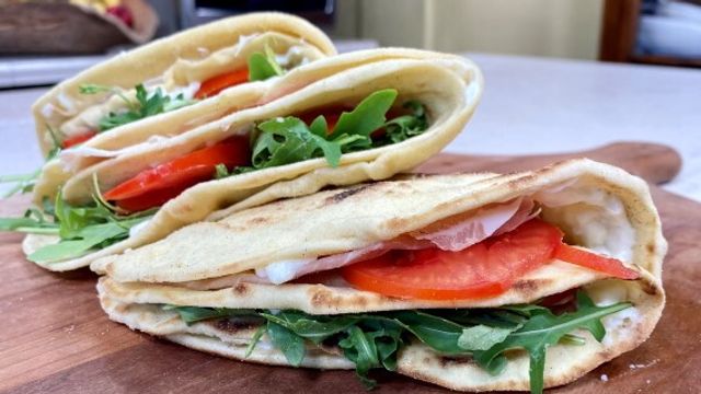 Fate cuocere poi in una padella per circa 40/50 secondi per lato. Se durante la cottura si formano delle bolle sarà indice di qualità dell’impasto. Dividete la piadina in 4 senza tagliare e farcire ogni angolo con singoli ingredienti (mettete formaggio su tutta la superficie). Fate solo 1 taglio dal centro fino al bordo. Chiudete il tutto.