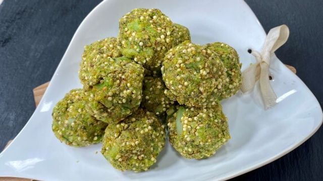 Unite poi due superfood: 20 grammi di semi di sesamo e 20 grammi di semi di chia. Ultimate con 30 grammi di formaggio grattugiato, se utilizzate quello vegetale la ricetta sarà perfetta anche per i vegani. Infine versate il pangrattato per dare forma alle polpettine. Mettetele in una teglia su carta forno e fate cuocere a 180 gradi per 7 minuti.