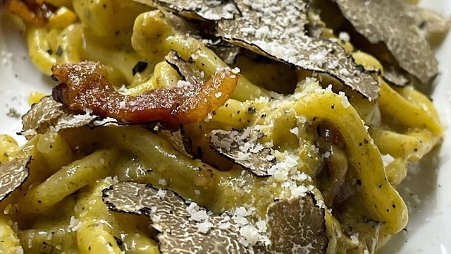 Una volta impiattato, aggiungere il guanciale per guarnire e, infine, del tartufo a scaglie. È molto importante la scelta del tartufo: lo chef predilige il tartufo nero.