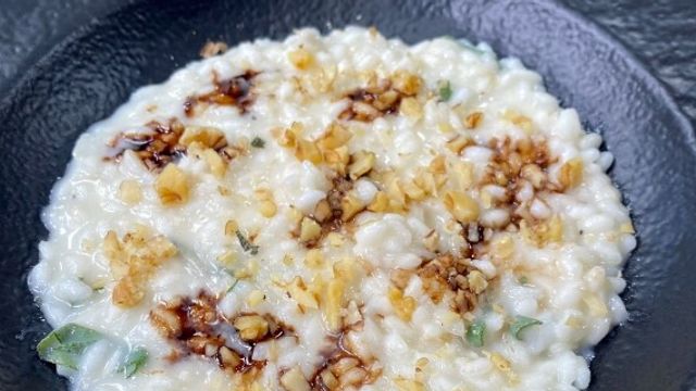 Unite 25 grammi di burro e 60 grammi di gorgonzola dolce. Completate il tutto con 25 grammi di pecorino. Impiattatate aggiungendo le noci tritate e qualche goccia di aceto balsamico.