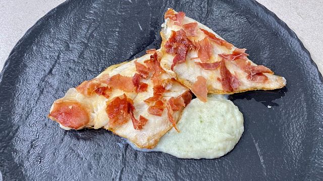 Lessate o cuocete a vapore 250 grammi di cavolfiore. Per il cruble di prosciutto potete mettere le fette per 1 ora a 160 gradi in forno oppure 2 minuti nel microonde alla massima potenza. Lasciatelo raffreddare e poi tagliuzzatelo. Passate poi alla cottura del pesce. Fate scaldate dell'olio Evo in padella e aggiungete i filetti di pesce bianco (orata, spigola) prima sul lato della polpa. Girate e completate la cottura sul alto della pelle e salate.
