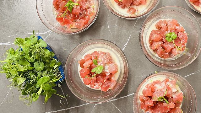 Impiattare in una piccola fondina o ciotola, porre la tartare fatta a pallina, versare tutt’intorno l’acqua di cocco e mozzarella, grattugiare del lime e dare un giro di olio Evo.