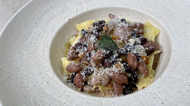 Nel frattempo sciogliete del burro in una padella e aromatizzatelo con delle foglie di salvia. Aggiungete ai fagioli dell'alloro. Togliete la salvia e aggiungete il burro ai legumi. Frullate il tutto. Cuocete la pasta per le lasagne spezzettandola prima. Impiattate versando la crema di fagioli, fate seguire la pasta condita semplicemente con l'olio, aggiungete i fagioli interi, del formaggio grattugiato e la salvia passata nel burro.