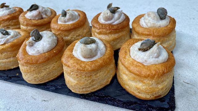 Una volta cotto, tagliate il pollo a tocchetti e frullate con i funghi insieme a 60 grammi di formaggio grattugiato. Amalgamate il pollo con la besciamella e mettete il composto in una sac à poche. Disponete i vol-au-vent su una teglia con carta forno e riempiteli di crema di pollo e funghi, aggiungete dei capperi e infornate a 200 gradi per 5/10 minuti.