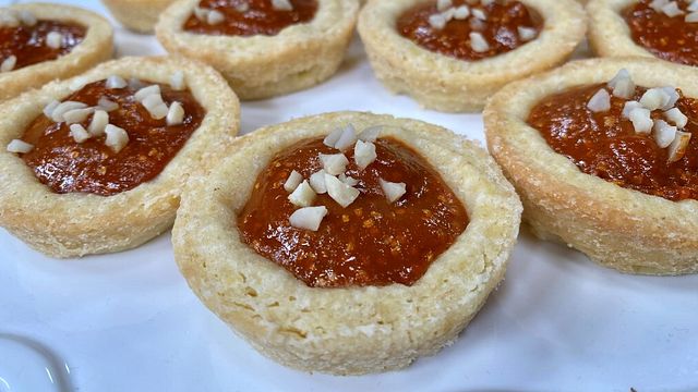 Rimettete le bacche di goji nel pentolino, sciogliete in acqua fredda 15 grammi di amido di mais e unite alle bacche frullate nel pentolino sul fuoco. Portate nuovamente a bollore e fate solidificare. Una volta freddo, mettete il composto in una sac à poche. Con la frolla foderate degli stampini monoporzione e aggiungete dei fagioli in modo che la pasta non si gonfi. Infornate a 180 gradi a funzione statica per 12 minuti. Fate raffreddare, togliete i fagioli e farcite con la confettura. Cospargete di mandorle a granella e servite.