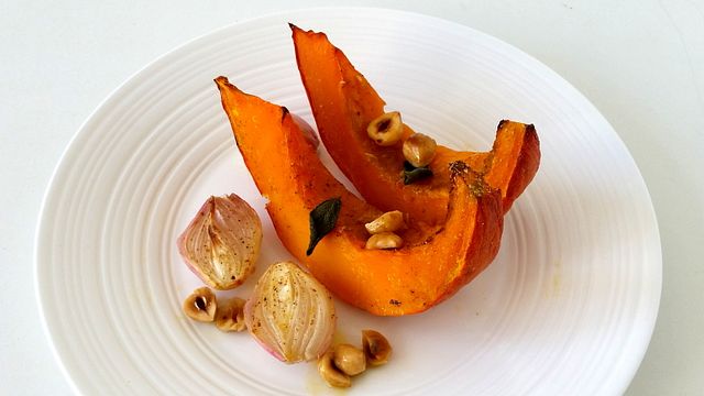 Se avete voglia di un contorno dallo stile autunnale, saporito e sostanzioso provate questo piatto. Un perfetto abbinamento fra la croccantezza delle nocciole, la cremosità della zucca, la dolcezza degli scalogni e il gusto amarognolo e aromatico della salvia. Un piatto veloce e facile da preparare perchè una volta infornata la teglia non c’è più niente da fare se non aspettare che finisca di cuocere. Al posto delle nocciole potete usare le mandorle e se vi piacciono i gusti decisi potete insaporire la zucca con della paprika dolce affumicata o della curcuma in polvere per darle carattere e profumo. Io ho usato l’olio extra vergine di oliva ma se siete amanti del burro è perfetto in questa preparazione.
