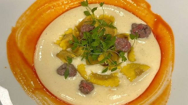 in una fondina, pennellare la base con l’agrodolce di peperoni, adagiare nel centro della fondina la spuma di polenta, dentro quest’ultima mettervi i ravioli mantecati e completare il piatto con qualche mini mondeghiro di pasta di salame e una polvere di salvia essiccata.