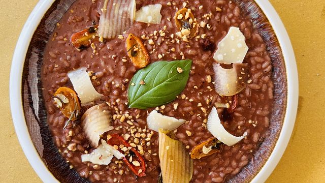 Quando il risotto sarà cotto aggiungere il restante Barolo, fuori dal fuoco l’altra metà del burro ben freddo ed il parmigiano reggiano, mantecando.