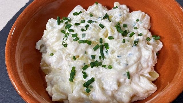 Dopo aver sbianchito le cipolle mettetele a marinare in aceto di vino rosso e sale. Aggiungete l'erba cipollina alle patate lessate. Unite la cipolla lessata bene. Fate una salsa con 350 grammi di yogurt greco e 4 cucchiai di maionese. Salate le patate e la salsa e amalgamate il tutto.