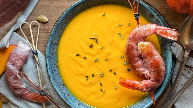 Ma a rendere davvero particolare e ad arricchire questa crema di zucca alla curcuma sono gli irresistibili spiedini di gamberi e Prosciutto Toscano DOP, golosi e saporiti, che rendono questo primo piatto degno di far parte di un menù importante.