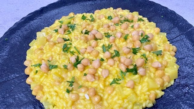 Mettete a bagno per 12 ore 180 grammi di ceci secchi piccoli. Scolate i ceci e metteteli in pentola a pressione, in 30 minuti saranno pronti. Nel frattempo pelate una patata da 200 grammi e fatela a dadini piccoli. Per il risotto mettete la cipolla in padella ben tritata, fatela appassire e aggiungete del brodo vegetale. Tostate 320 grammi di riso e sfumate con il vino bianco. Asciugato il vino aggiungete i ceci le patate e salate.