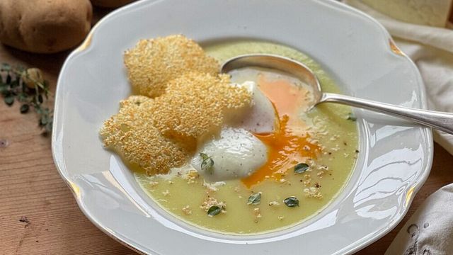 Servire la crema di patate con uovo in camicia e cialda al Pecorino Romano DOP ben calda.