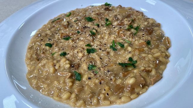 Mettete in acqua tiepida 40 grammi di porcini secchi, strizzateli e sminuzzateli a coltello. Metteteli poi in padella con olio e 160 grammi di riso per risotti. Sfumate con vino bianco per dare acidità.