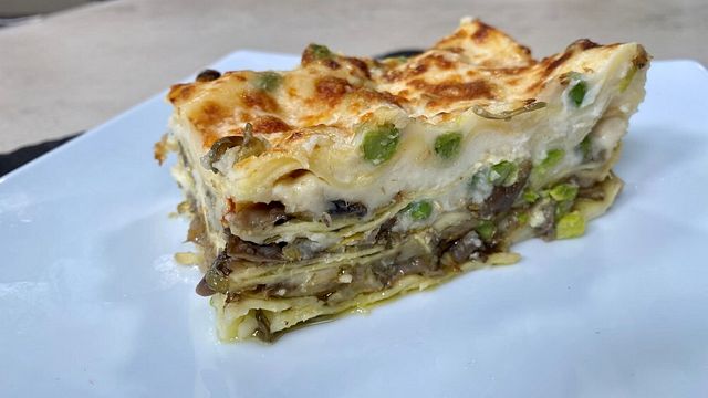 Quando è quasi pronta, salate la besciamella. Impiattate la lasagna stendendo il primo strato di besciamella, aggiungete la pasta, un secondo strato di besciamella con il misto vegetale, del formaggio grattugiato e continuate con gli strati. L'ultimo strato sarà solo di besciamella e formaggio grattugiato. Infornate a 180 gradi per 20 minuti.